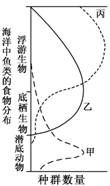 如图纵向表示海洋不同深度中鱼类的食物分布状况,曲线甲、
