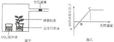 浓度恒定),在不同强度的光照条件下测得的单位时间内气体体积的变化量如图乙所示,请据图回答: