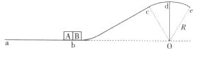 (10分)如图所示,一条轨道固定在竖直平面内,粗糙的ab段水平,bcde段光滑,cde段是以O为圆心、R为半径的一小段圆弧。可视为质点的物块A和B紧靠在一起,静止于b处,A的质量是B的3倍。两物块在足够大的内力作用下突然分离,分别向左、右始终沿轨道运动。B到d点时速度沿水平方向,此时轨道对B的支持力大小等于B所受重力的3/4,A与ab段的动摩擦因数为μ,重力加速度g,求: