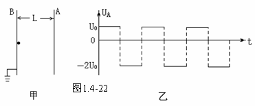 如图1.4-22甲所示,A、B是真空中的两块面积很大的平行金属板,相距为L,加上周期为T的交流电压,在两板间产生交变的匀强电场.已知B板的电势为零,A板的电势UA随时间变化的规律如图1.4-22乙所示,其中UA最大值为U0,最小值为-2U0.在靠近B板的P点处,不断地产生电量为q、质量为m的带负电的微粒,各个时刻产生带电微粒的机会均等到,这种微粒产生后,从静止出发在电场力的作用下运动,设微粒一旦碰到金属板,它就附在板上不再运动,且其电量同时消失,不影响A、B板的电压.已知上述的T、U0、L、q和m等各量正好满足等式L2=(3U0/16)(T/2)2,若在交流电压变化的每个周期T内,平均产生400个上述微粒.求(不计重力,不考虑微粒之间的相互作用):