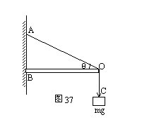 如图37所示,质量为m的物体用细绳OC悬挂在支架上的O点,轻杆OB可绕B点转动,求细绳OA中张力T大小和轻杆OB受力N大小。