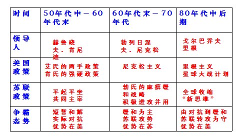 思考1:归纳总结出美苏争霸在60年代后期--80年代双方态势的变化历程,找出态势变化的原因