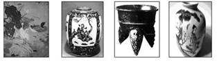 ①图1在图案与素地接合处微显高低,呈现一丝裂痕,犹如镂刻而成②图2该彩瓷以青花、釉里红、釉上五彩、釉上彩和釉下彩相结合 ③图3陶土经过淘洗,轮制,再经打磨,烧成漆黑光亮,有“蛋壳陶”之称④图4受珐琅彩制作工艺影响而创造的一种釉上彩