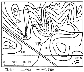 40. 下图甲是某日昼长状况,乙图是我国东部沿海某地等高线示意图,回答问题。(28分)