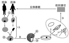 (1)过程A表示 ,是目前实现体细胞克隆的关键技术,该技术的主要操作是应用患者的体细胞作为核供体,由① 细胞提供细胞质,进行人工重组。
