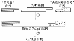 11.来源于豇豆的胰蛋白酶抑制剂基因(CpTI基因)具有广谱的抗虫特性。但直接把该基因转入农作物后,发现转基因植株中合成的CpTI蛋白质的积累量并没有达到强烈抑制害虫的程度。于是,科研工作者在体外对CpTI基因进行了修饰,在其两端分别融合了“信号肽”序列和“内质网滞留信号”序列,在它们的共同作用下,CpTI蛋白质在转基因植株中的积累量得到了明显提高。修饰和表达过程如图所示: