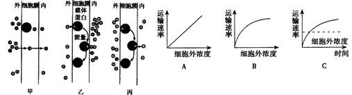 1.下图中甲、乙、丙表示物质出入细胞方式 ,A、B、C、表示在一定范围内细胞膜外物质进入细胞膜内的三种不同的的情况,请根据下图回答下面问题: