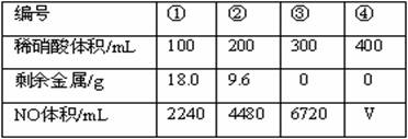 21、(本小题10分)铁粉和铜粉的均匀混合物,平均分成四等份,分别加入同浓度的稀硝酸,充分反应,在标准状况下生成NO的体积和剩余金属的质量如下表(设硝酸的还原产物只有NO):