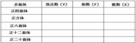 问题:(1)请你数一下上面图中每一个多面体具有的顶点数(V),棱数(E)和面数(F),并且把结果填入下表: