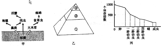 (3)有人研究该生态系统中食草虫个体存活数与发育期的关系,结果如丙图。从中可推知食草虫死亡率最大的时期是 。