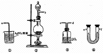 ⑷ 乙同学认为甲同学实验中有缺陷,不能证明最终通入AgNO3溶液中的气体只有一种。为了确保实验结论的可靠性,证明最终通入AgNO3溶液中的气体只有一种,乙同学提出在某两个装置之间再加装置⑤。你认为装置⑤应加在 之间(填装置序号)。瓶中可以放入 。