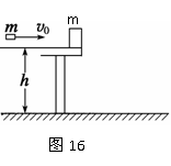 36.(18分)如图16,一质量为m 的物块静止在桌面边缘,桌面离水平地面的高度为h。一质量也为m 的子弹以水平速度v0射入物块后,以水平速度v0/2射出,重力加速度为g。求: