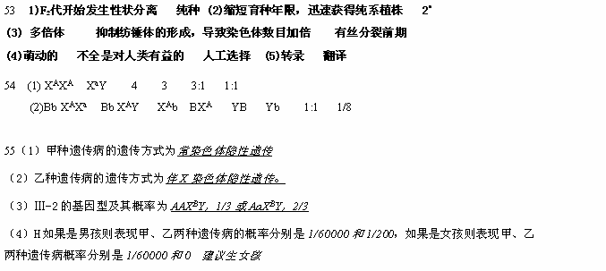 55(2008江苏高考 12分)下图为甲种遗传病(基因为A、a)和乙种遗传病(基因为B、b)的家系图。其中一种遗传病基因位于常染色体上,另一种位于X染色体上。请回答以下问题(概率用分数表示)。