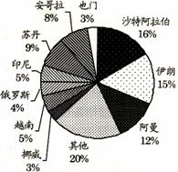 图甲:世界能源消费构成比例图 图乙:2002年中国原油进口来源分布图
