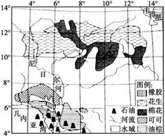 17.为加深中非传统友谊,落实北京峰会成果,国家主席胡锦涛于2007年1月30日至2月10日对非洲八国进行国事访问。这是继2006年4月30日圆满结束对非洲三国进行国事访问的又一次“友谊之旅,合作之旅”。2008年1~10月,中非贸易额达到927亿美元,2008年中非贸易额突破1000亿美元的目标提前两年实现,这一数额是30年前的130倍。读“尼日利亚经济略图”,回答下面各题。