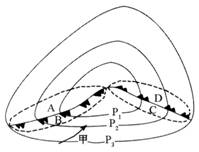 右下图中P1、P2、P3表示的等压线,甲处的箭头表示风向。读图分析回答问题。(6分)