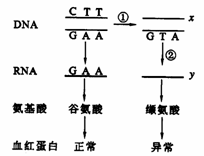 (2) 下图表示人类镰刀型红细胞贫血病的病因,请据图回答(已知谷氨酸的密码子是GAA,GAG)