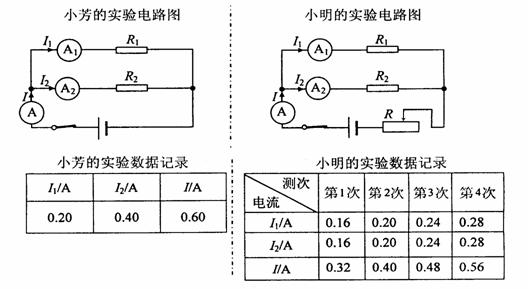 17.(10分)小明和小芳分别设计了探究“并联电路电流规律”的实验,他们各自设计的实验电路图及实验数据记录如图16所示。 (小芳和小明电路连接及记录的数据都没有错误。)
