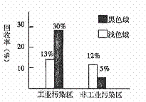 (3)实验结果:如表1。根据表内数据在右下空白处绘制A、B两地区不同体色蛾回收率的柱形图。