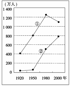 (2)与F城相比,E城的城市规模从小到大,说明 运输对城市发展具有明显的推动作用。(3)图2的①、②两线中,反映G城人口变化特点的是 线。这说明20世纪80年代以来,G城