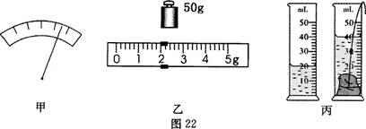 (1)调节天平横梁平衡时,发现指针在分度标尺上的位置如图22甲所示,此时应将平衡螺母向_______(选填“左”或“右”)调节。