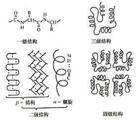 -级结构:又称初级结构或化学结构,是指蛋白质分子的多肽链中氨基酸的种类、数量和排列顺序。