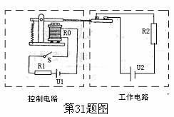 31.小明在研究性学习活动中,查阅到一种热敏电阻的阻值随温度变化的规律如下表,并将该型号的热敏电阻应用于如图所示有“控制电路”和“工作电路”组成的恒温箱电路中。