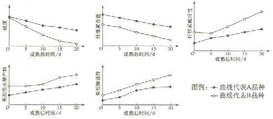 桃果实成熟后,如果软化快,耐贮运性就会差。下图表示常温下A、B两个品种桃果实成熟后硬度等变化的实验结果。