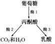 解析:由图解可知葡萄糖产生丙酮酸是细胞呼吸的第一个阶段,在细胞质基质中进行。丙酮酸彻底氧化分解成CO2和H2O是在线粒体中进行的。丙酮酸变成乳酸是无氧呼吸,在细胞质基质中进行。