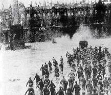 18、一部影片有一组镜头:夜色中,成群的武装起义者冲向首都的一座官邸,从停在不远处河面上的战舰传来隆隆炮声;人流很快冲垮了守卫部队设立的防线,宫邸沉重的大门在一起者的呼喊中缓缓打开。这组镜头所取材的历史事件发生在 ( )