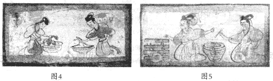 图4、图5是甘肃嘉峪关、酒泉一带魏晋古墓中发现的以庖厨为题材的彩绘墓砖。这两幅图