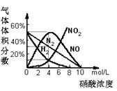 各气体产物成分及含量随HNO3浓度变化曲线如图所示。