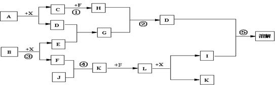 22.(12分)已知A、B均是由两种元素组成的化合物,A中某种元素的质量分数为75% ,B是一种淡黄色固体,C、J是同周期元素的气态氢化物,其中C是含氢量最高的烃,X为无色液体。反应生成的水均已略去。它们有如下图所示的关系。![]()