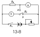 滑动变阻器一只,电源4.5 V,电键2个,如图13-8,当电键K2连a时,两电表的指针偏转角度都在满偏的4/5处;若将K2接b时,其中一个电表的指针偏角几乎不变,另一个电表的指针偏转到满偏的3/4处.该学生所选用的电压表的量程为________,所用的电流表的量程为________,该电阻的阻值为________.