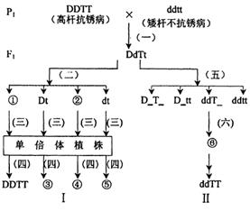 现有两个小麦品种,一个纯种小麦性状是高杆(D),抗锈病(T);另一个纯种小麦的性状是矮杆(d),易染锈病(t)。两对基因独立遗传。育种专家提出了如图所示的Ⅰ、Ⅱ两种育种方法以获得小麦新品种。问:(1)Ⅰ培育方法是_______,依据的变异原理是______,Ⅱ培育方法是____,依据的变异原理是_____,要缩短育种年限,应选择的方法是___________。