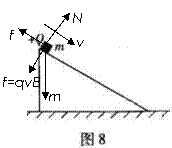 [解析]取物块为研究对象,小滑块沿斜面下滑由于受到洛伦兹力作用,如图所示,C正确;N=mgcosθ+qvB,由于v不断增大,则N不断增大,滑动摩擦力f=μN,摩擦力增大,A错误;滑块的摩擦力与B有关,摩擦力做功与B有关,依据动能定理,在滑块下滑到地面的过程中,满足