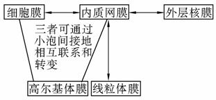 真核细胞有一个复杂的膜系统,各种细胞器的膜和核膜、细胞膜在分子结构上都是一样的,它们统称为生物膜。真核生物的生物膜约占细胞干重的70%-80%,最多的是内质网膜。生物膜主要由磷脂和蛋白质分子组成,其基本骨架为磷脂双分子层,蛋白质分子覆盖、贯穿或镶嵌在磷脂双分子层中。生物膜不是固定不变的,而是经常处于动态变化之中,磷脂双分子层具有一定的流动性,其磷脂类分子可以自由地移动,蛋白质分子也可以在磷脂双分子层中移动。其中需要注意的是内质网膜,它向外与细胞膜相连,向内与核膜的外膜相通,形成细胞内的管道运输系统。生物膜在结构和功能上是密切联系的,可用如下的图示表示: