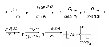 1. 随着社会的发展科技的进步,合成材料的使用面更广泛,作用也越来越重要。聚甲基丙烯酸甲酯(有机玻璃)以质轻、易加工和透光性好等特点广泛用于制造飞机、汽车玻璃、电学仪器、医疗器械等方面。下图是以物质A为起始反应物合成有机玻璃的路线。