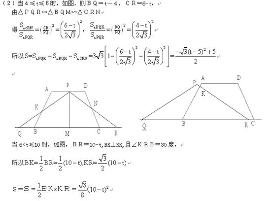 3.(08广东广州)25、(2008广州)(14分)如图11,在梯形ABCD中,AD∥BC,AB=AD=DC=2cm,BC=4cm,在等腰△PQR中,∠QPR=120°,底边QR=6cm,点B、C、Q、R在同一直线l上,且C、Q两点重合,如果等腰△PQR以1cm/秒的速度沿直线l箭头所示方向匀速运动,t秒时梯形ABCD与等腰△PQR重合部分的面积记为S平方厘米