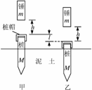 柴油打桩机重锤的质量为m,锤在桩帽以上高度为h处(如图甲所示)从静止开始沿竖直轨道自由落下,打在质量为M(包括桩帽)的钢筋混凝土桩子上.同时,柴油燃烧,产生猛烈推力,锤和桩分离,这一过程的时间极短.随后,桩在泥土中向下移动一距离l.已知锤反跳后到达最高点时,锤与已停下的桩帽之间的距离也为h(如图乙所示).已知m=1.0×103 kg,M=2.0×103 kg,h=2.0 m,l=0.20 m,重力加速度g取10 m/s2,混合物的质量不计.设桩向下移动的过程中泥土对桩的作用力F是恒力,求此力的大小.
