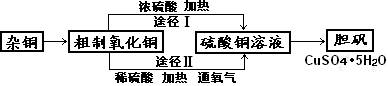 (2)通过途径II实现用粗制氧化铜制取胆矾,必须进行的实验操作步骤:酸溶、加热通氧气、过滤、________、冷却结晶、 、自然凉干。
