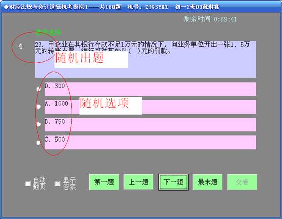 1、本考试系统具有出题随机、选项随机二组随机功能,尽管题板文字字体较大(更人性化些),但相邻间作弊的可能性几乎为零,显示机号功能,也方便核对考生信息,在局域网组织考试保密性相当强,在同类软件中本系统做得应该说是相当好的。(下图中题号,A,B,C,D实际测试时应删除掉)