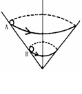 如图所示,倒置的光滑圆锥面内侧,有质量相同的两个小玻璃球A、B,沿锥面在水平面内作匀速圆周运动,关于A、B两球的角速度、线速度和向心加速度正确的说法是 ( )