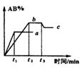 2AB;△H = Q kJ/mol 的反应时间与生成物AB的质量分数(AB%)的关系如图所示,其中a为500℃,b为300℃时的情况(其他条件不变),c则为在时刻