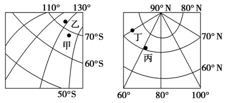 解析:读图可知甲、乙两地位于南半球,甲位于乙的西北方向,丙、丁位于北半球,丙位于丁的东南方向;丁位于东经40度,甲位于西经130度以西,因而丁在甲的东北方向;乙位于西经130度以东,因而乙在丁的西南方向。国际标准时间为3月21日8时整,甲地大约为3月20日23时,应位于夜半球;乙地位于西9区,区时为3月20日23时;丁地的地方时为10时40分;丙地为21日12时,从而可知丙地与甲地分属于两个不同的日期。6月22日为北半球夏至日,太阳直射北回归线,丙地太阳从正北方向升起,正午时太阳在南方的天空,正午太阳高度为43°26′;该日丙地出现极昼现象,当地0点时,太阳高度为3°26′。