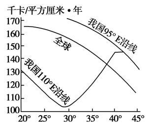 下图为我国与全球同纬度太阳辐射总量对比图。读图完成3-4题。