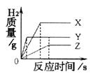 (太原成成中学九年级第五次月考)把相同体积、相同质量分数的稀盐酸,分别滴到等质量、颗粒大小相同的X、Y、Z三种较活泼金属中,生成H2的质量与反应时间的关系如右图所示。这三种金属的活动性顺序为