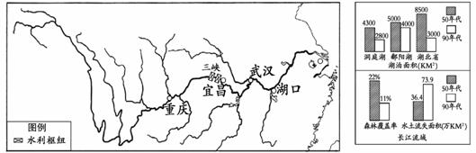 (3)据图10分析,20世纪90年代长江流域森林覆盖率、湖泊面积比50年代_______(增大或减小),而水土流失面积在_______(增大或减小),造成这种现象的人为原因主要是___________,这给下游河段带来的影响主要有_______________________________等。