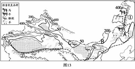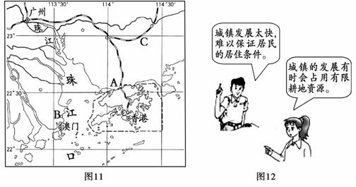 图11中A是___________(经济特区);B是___________经济特区);C是__________线(铁路干线)。
