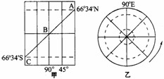 (2)根据甲图在乙图中画出晨昏线,用斜线表示夜半球。